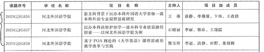 河北外国语学院分别由王旭、郑丁、王蓓、石晓丽、郭玉玲主持,由19名教师为成员的5个项目顺利获批立项。
