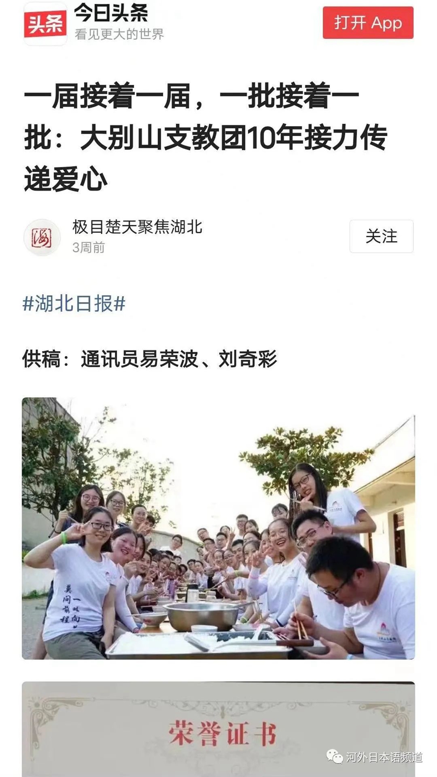 河北外国语学院日语学院2019级本科2班的任佳选同学响应号召,用实际行动带领山区的留守儿童走出教育困境,帮助他们去追寻更美好的未来。此事对社会影响颇深,被《湖北日报》、《楚天都市报》等多家报社相继报道。同时被学习强国、今日头条、央视新闻客户端等平台进行转载。