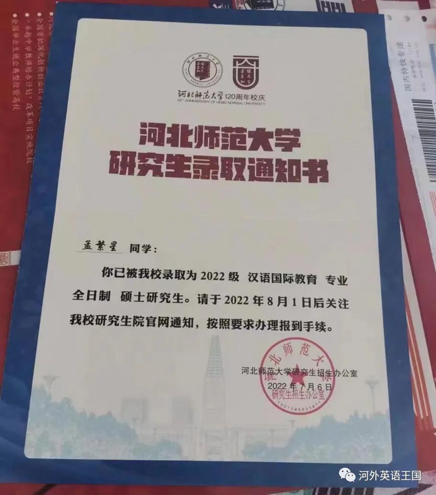 大家好,我是河北外国语学院英语学院18本五班的孟繁星,报考了河北师范大学的汉语国际教育专业,现已被拟录取。