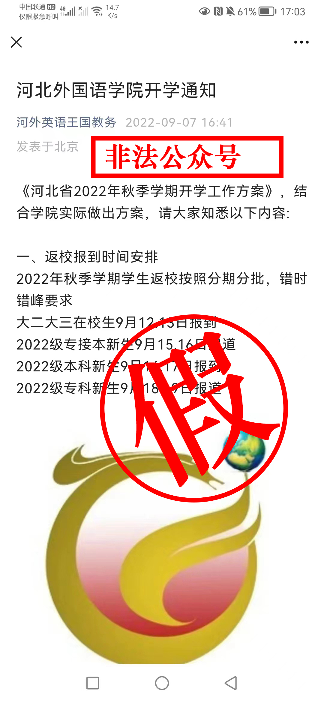 9月7日,一个个人注册的非法微信公众号“河外英语王国教务”,发布“河北外国语学院开学通知”,经查实此消息纯属有人故意造谣。请广大同学、家长、老师不要相信,请大家一定要从学校官网、官微等官方权威渠道获取信息,不传谣、不信谣。此非法公众号所有造谣证据已经留存,已报公安机关进行处理。