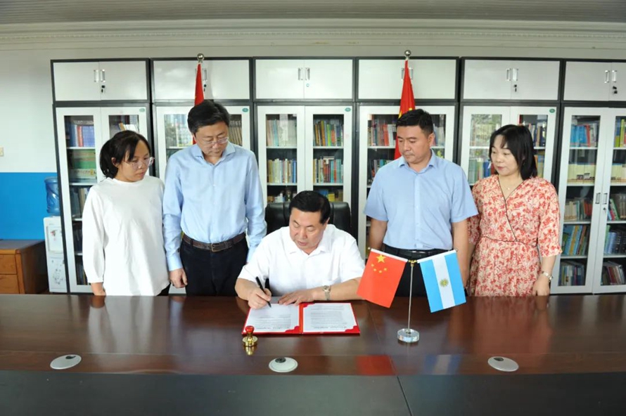2022年9月21日,河北外国语学院与阿根廷贝尔格拉诺大学举行线上签约仪式,河北外国语学院董事长、校长孙建忠院士与贝尔格拉诺大学董事长、校长玛丽亚·马尔赛拉·波尔多共同在合作协议书上签字。