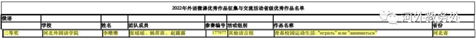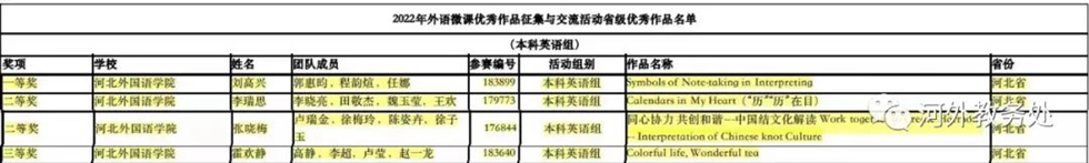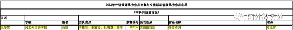 近日,第八届全国外语微课大赛公布了复赛阶段的赛事结果,河北外国语学院教师荣获多个奖项:英语学院刘高兴团队作品荣获一等奖,英语学院李瑞思团队作品、欧亚语言学院李珊珊团队作品、教师教育学院张晓梅团队作品荣获二等奖,国际语言教育学院霍欢静团队、日语学院石晓团队荣获三等奖。