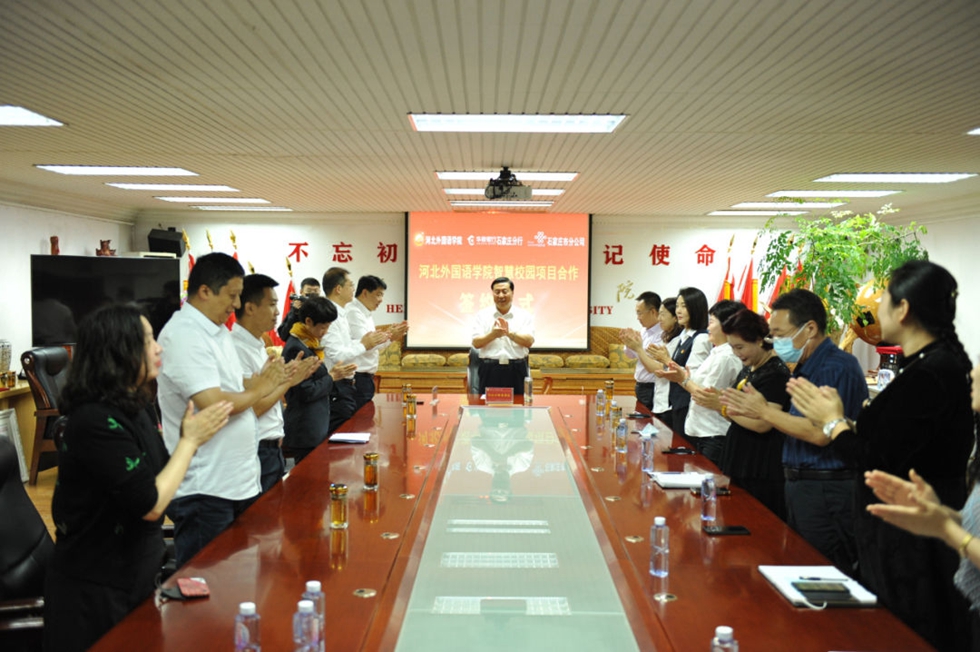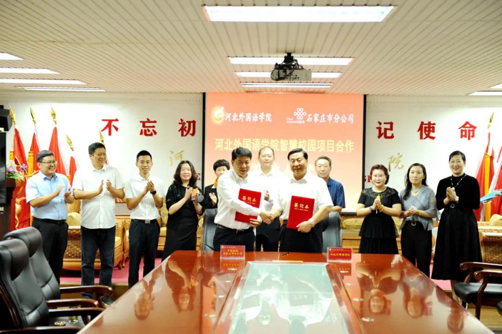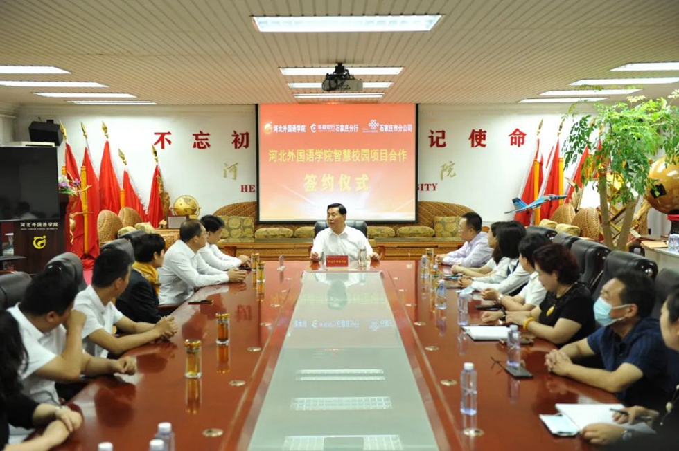 2022年9月29日上午,在国庆节到来前夕,河北外国语学院迎来了又一盛事——河北外国语学院智慧校园项目合作签约仪式成功举行。河北外国语学院、华夏银行石家庄分行、中国联通石家庄市分公司校企银合作共建“河北外国语学院智慧校园”。