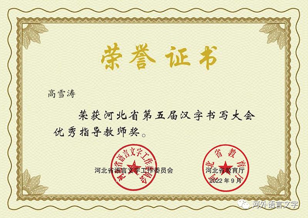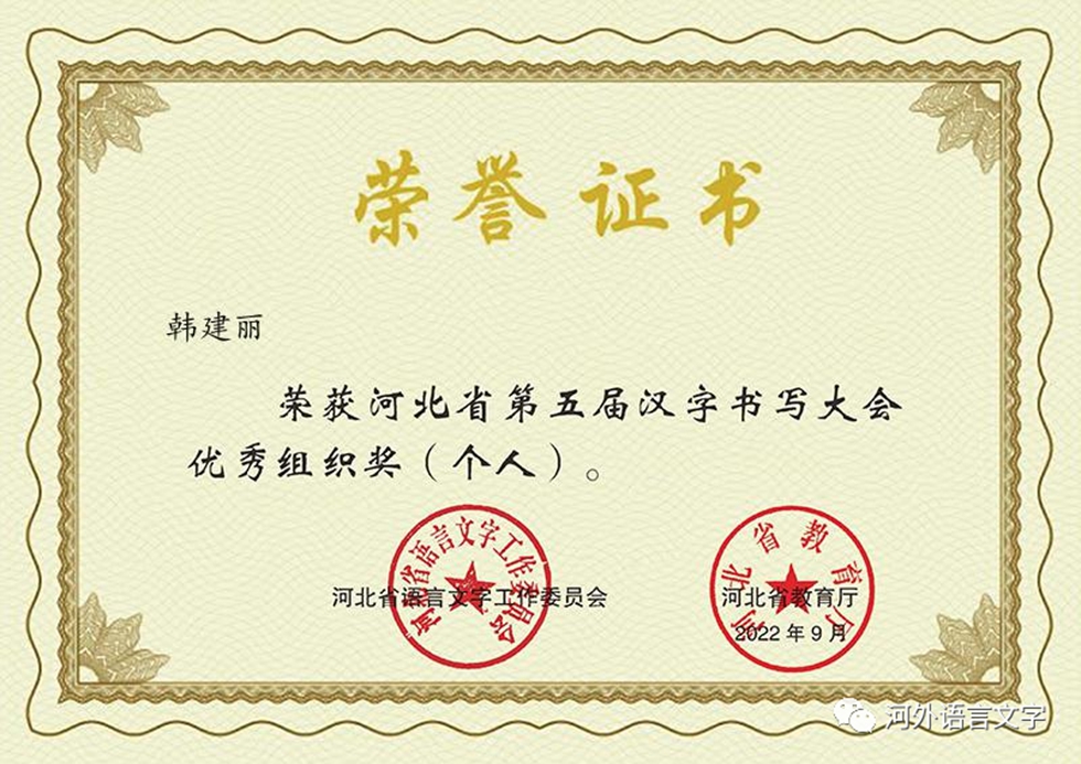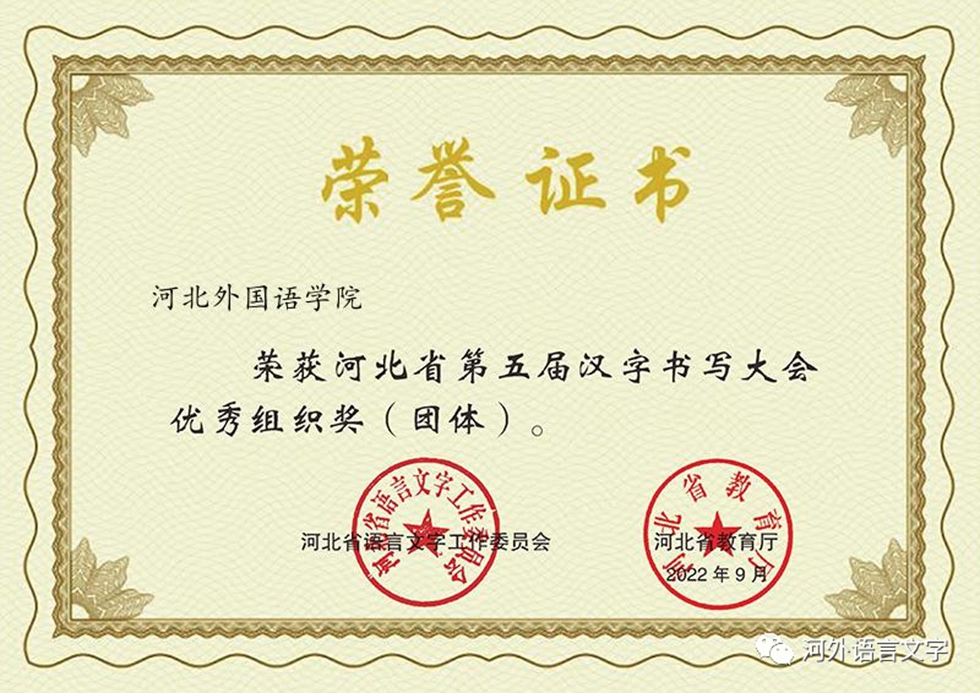 根据《河北省语言文字工作委员会 河北省教育厅关于举办第四届中华经典诵写讲“笔墨中国”汉字书写大赛河北省选拔赛暨河北省第五届汉字书写大会的通知》(冀教语函〔2022〕2号)精神,经过专家评委会评审,河北外国语学院获得大学生组三等奖1个,优秀奖3个,优秀指导教师1个,优秀组织个人1个,优秀组织奖1个,下面是本次获奖具体情况: