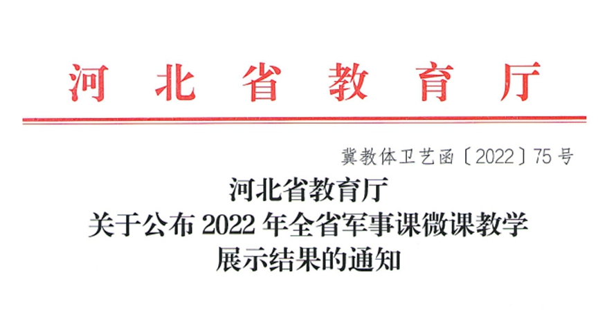11月10日,河北省教育厅印发《关于公布2022年全省军事课微课教学展示结果的通知》,河北外国语学院王洁老师荣获2022年全省军事课微课教学展示高校组三等奖!