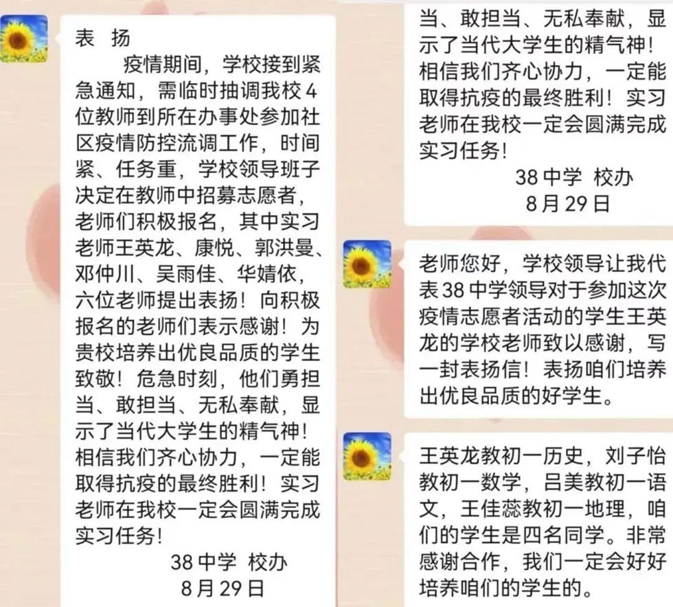 2022年11月3日凌晨,按照长安区委区政府和区教育局通知,学校立即启动了防控疫情应急响应工作预案:学生暂缓返校,学校中层以上领导和全体班主任封闭,驻校办公。王浩宇、陈君、刘婉琳、张佳欣、陈璐茗、朱伟莎、田甜甜7位实习生也加入了共同阻遏疫情蔓延的工作中。