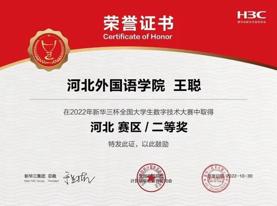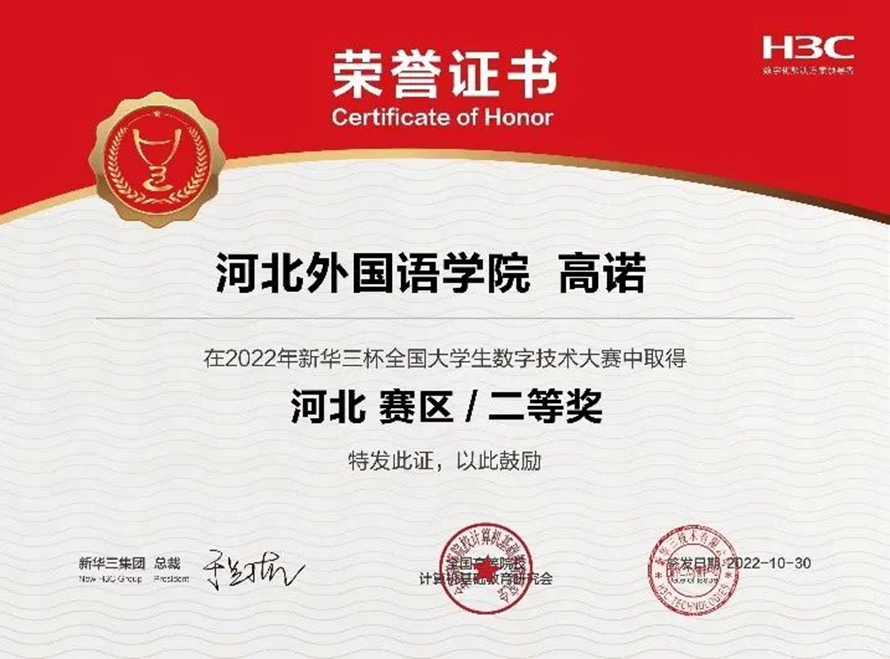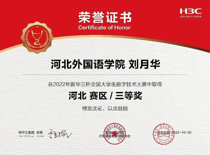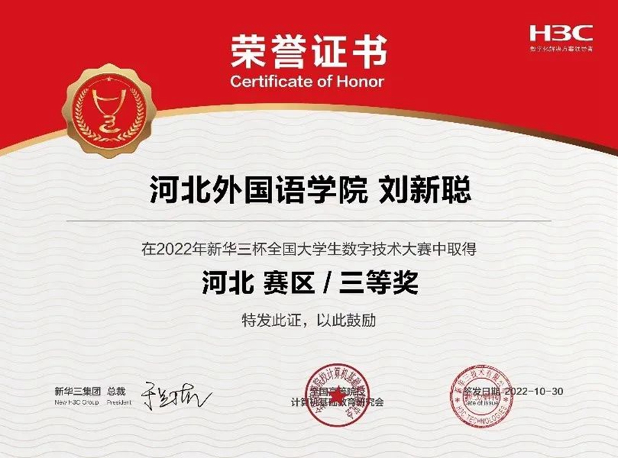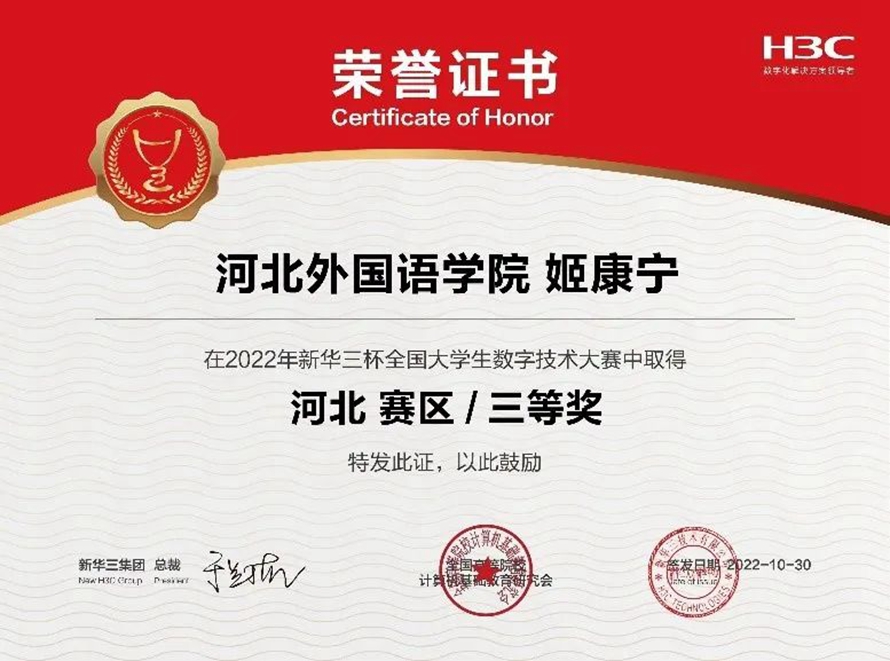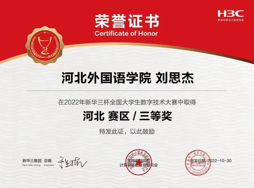见证青春,智竞明天。在2022年第十二届“新华三杯”全国大学生数字技术大赛中河北外国语学院计算机学院15名学子在河北赛区参赛并取得优异成绩,获得奖项。