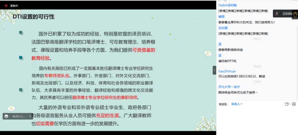 党的二十大胜利召开,我们国家进入全面建设社会主义现代化国家开局起步的关键时期,时代为教育发展指出了新方向,提出了新要求。新的战略发展机遇要求外语学科必须高质量发展,外语人才培养必须高质量发展,外语课程必须高质量发展,语言服务专业建设和产业提升的能力必须高质量发展。为落实好党的二十大精神,河北省翻译学会邀请到了全国翻译界知名专家、学者为大家做线上专题报告和交流,坚持为党育人、为国育才,促进新时代国际化人才培养,助推河北省对外交流与合作,提高语言服务质量,充分发挥学会的作用,助力提高语言人才自主培养质量,助力造就拔尖创新人才,引导广大人才爱党报国、敬业奉献、服务人民。