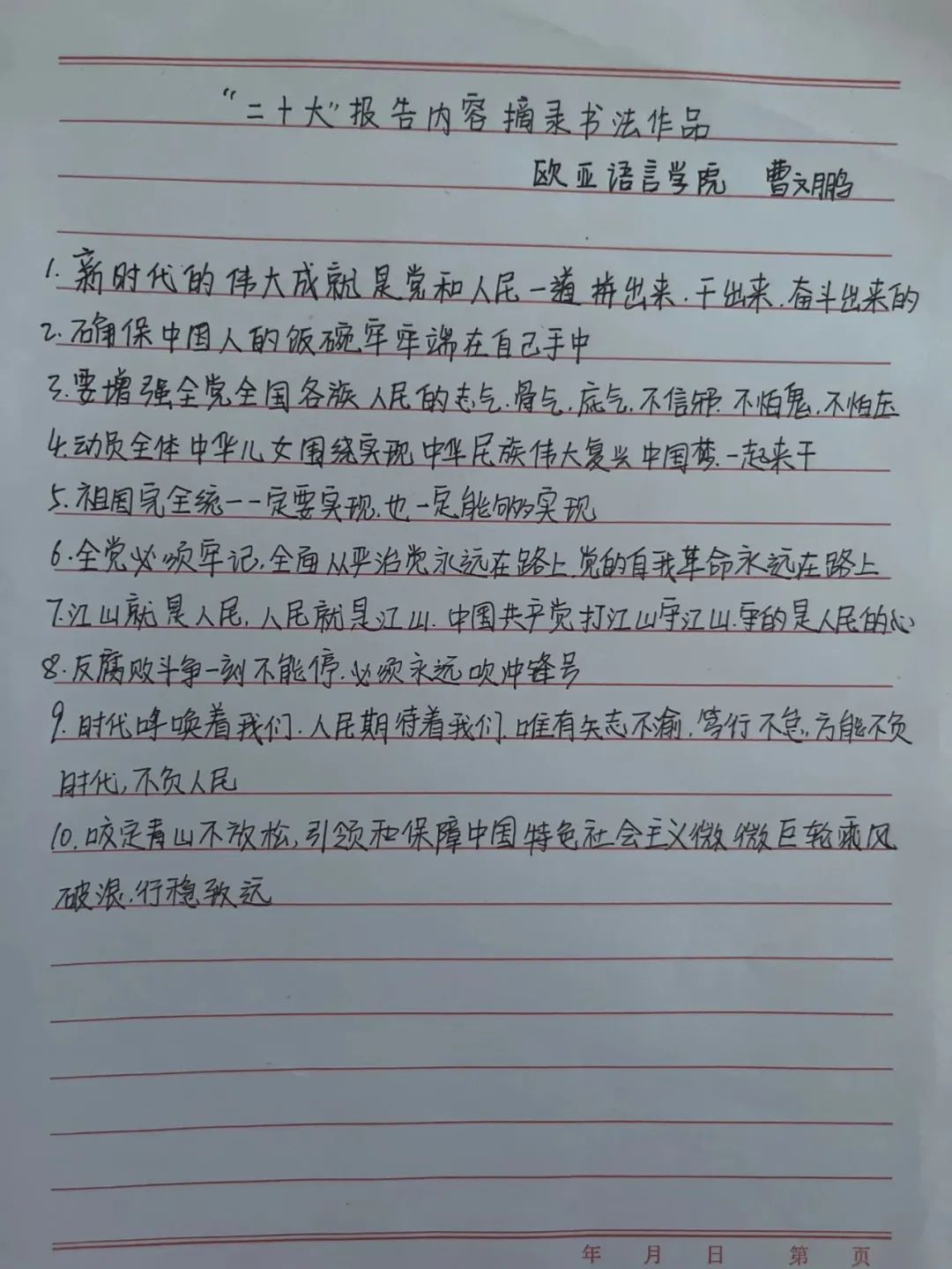 近日,为学习宣传贯彻党的二十大精神,以艺术的形式讲好中国故事,用艺术的语言传达时代心声,河北外国语学院精心筹划组织了“学习宣传贯彻党的二十大精神”主题艺术作品创作活动。