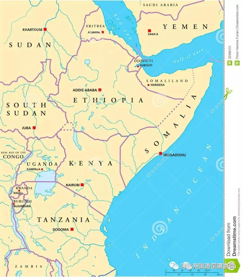 东非有10个国家涉及阿姆哈拉语、英语、阿拉伯语、法语、斯瓦希里语、卢旺达语、基隆迪语、索马里语8种语言,河北外国语学院语种已覆盖东非10国。