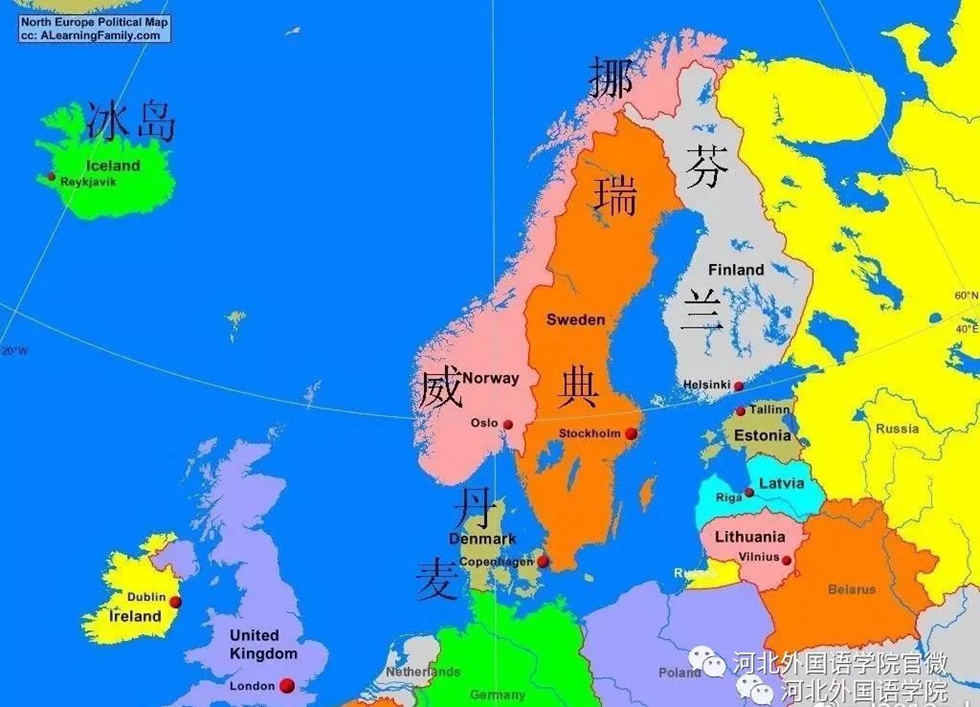 北欧有5个国家涉及瑞典语、丹麦语、芬兰语、挪威语、冰岛语、格兰陵语、法罗语7个语言,河北外国语学院语种已覆盖北欧除格陵兰所使用的格陵兰语和法罗群岛所使用的法罗语外的5个国家和5个语种。
