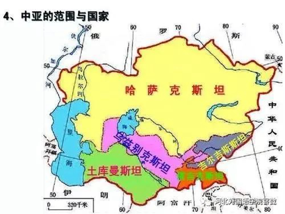 中亚有5个国家涉及哈萨克语、俄语、吉尔吉斯语、塔吉克语、乌兹别克语、土库曼语 6个语言,河北外国语学院语种已覆盖中亚5个国。