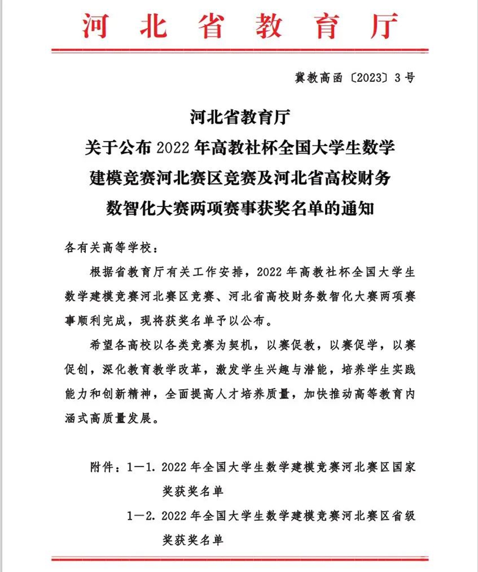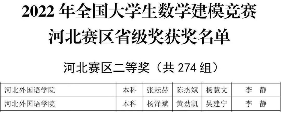 近日,河北省教育厅公布了2022年高教社杯全国大学生数学建模竞赛河北赛区竞赛获奖名单。河北外国语学院计算机学院由李静老师指导的张耘赫同学、陈杰斌同学、杨慧文同学组和杨泽斌同学、黄劲凯同学、吴建宁同学组斩获河北赛区二等奖。