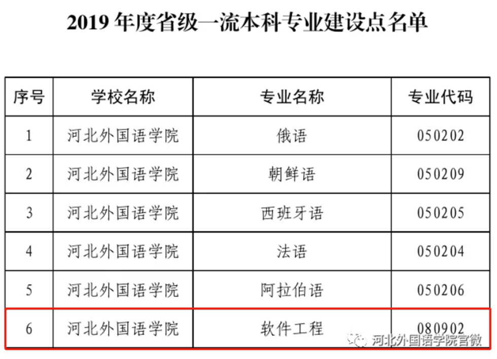 河北外国语学院软件工程(专业代码080902)本科专业是河北省2019年度省级一流本科专业建设点。