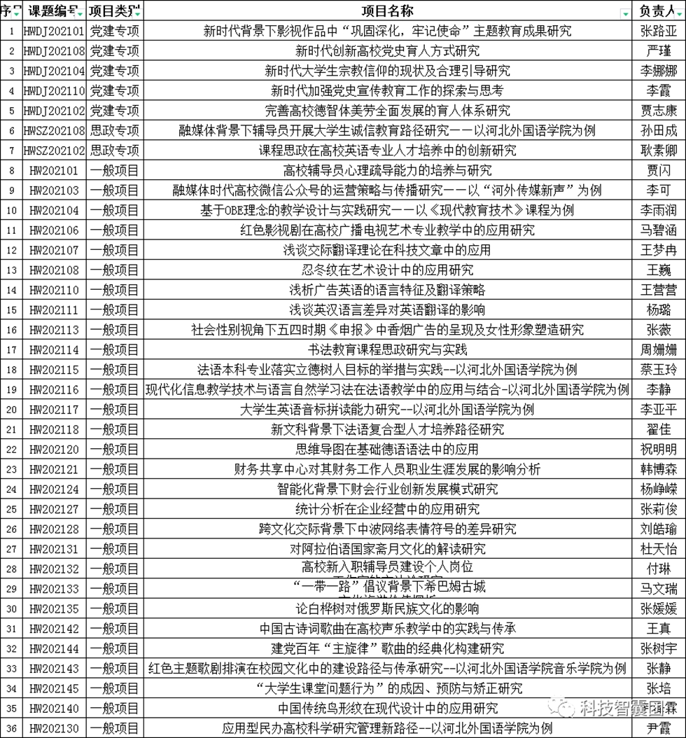 2022年校级课题第二次结项工作已经结束,本次共计36项课题顺利结项,其中传媒学院11项,德法语言学院6项,欧亚语言学院4项,国际金融学院3项,音乐学院3项,国际医学院2项,日语学院1项,国际商学院1项,西意葡语言学院1项,东方语言学院1项,英语学院1项,涉外建筑工程学院1项,科学技术处1项。