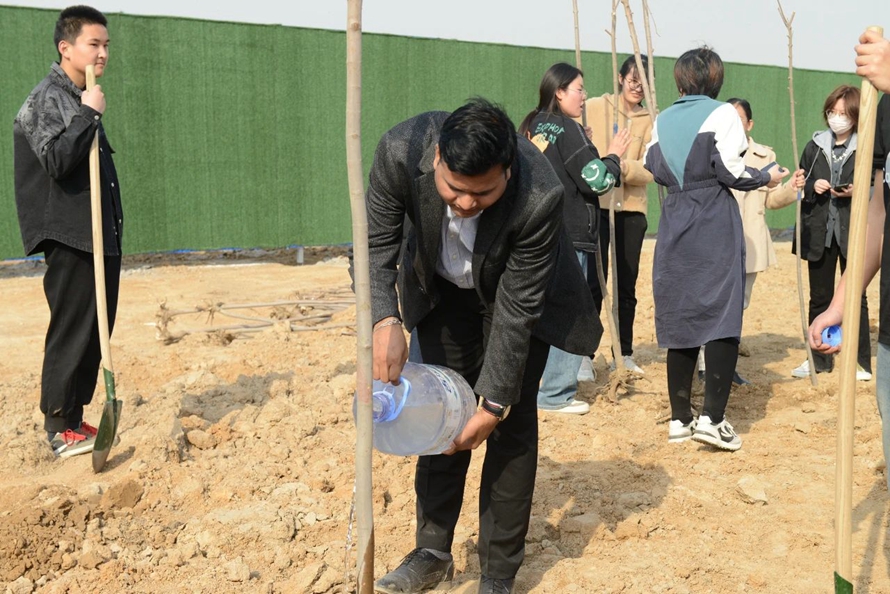 来自印度的 Kumar表示,今天植树非常开心,自己在印度老家也有农场,在中国很少参加这样的活动,所以这次很兴奋,感谢学校组织大家一起做非常有意义的事;听说每棵树可以以自己的名字命名,来自津巴布韦的Decide老师说,他女朋友因为有课,未能参加活动,于是在自己的树旁边也为女朋友种下了一棵树,希望他们的爱情地久天长。
