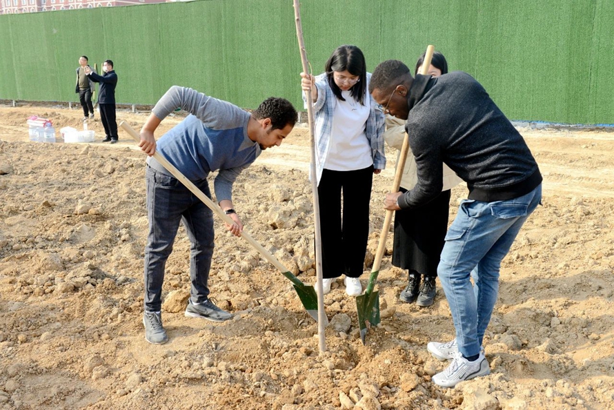 草树知春,芳菲斗艳。河北外国语学院在冀外国专家代表及河北科技大学留学生代表一路欢声笑语,携手共建国际友谊林。枫树象征鸿运,枫叶不仅呈红色,有霜叶红于二月花的美丽景色,枫叶也象征高洁、友谊和思念。一棵棵小枫树苗承载着国际友人的期望和祝愿,不到半小时就被深植到了河北外国语学院新校区的校园里。