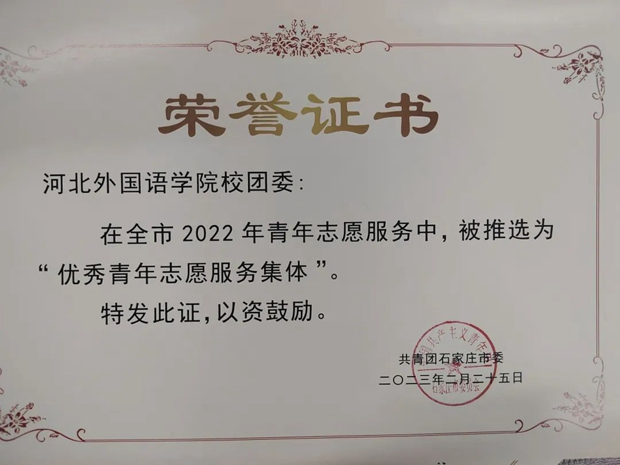2022年,河北外国语学院校团委积极践行志愿精神,在服务社会、服务青年、传播文明等方面都发挥了积极的作用。