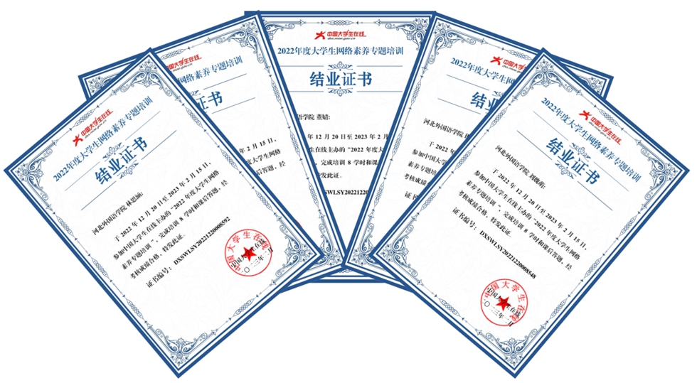 近日,中国大学生在线为河北外国语学院参加2022年度大学生网络素养专题培训的同学颁发了结业证书。