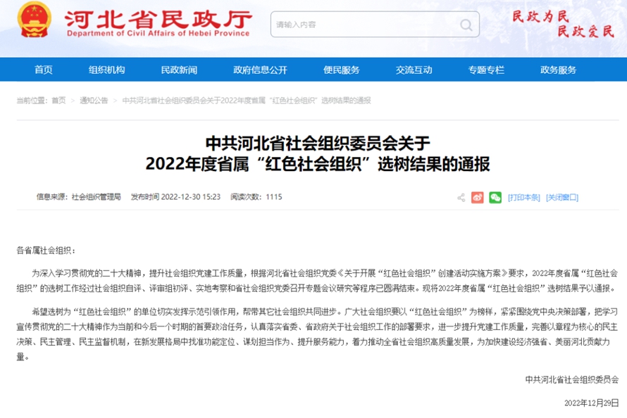 为深入学习贯彻党的二十大精神,提升社会组织党建工作质量,根据河北省社会组织党委《关于开展“红色社会组织”创建活动实施方案》要求,2022年度省属“红色社会组织”的选树工作经过社会组织自评、评审组初评、实地考察和省社会组织党委召开专题会议研究等程序已圆满结束。2022年底,中共河北省社会组织委员会将2022年度省属“红色社会组织”选树结果予以通报,河北外国语学院发起成立的河北省圣兰慈善基金会名列其中。