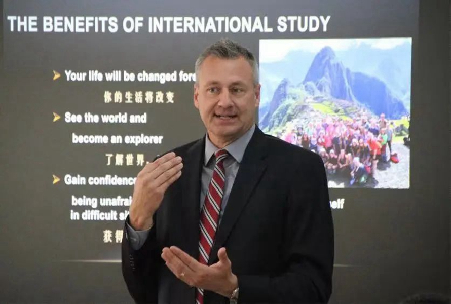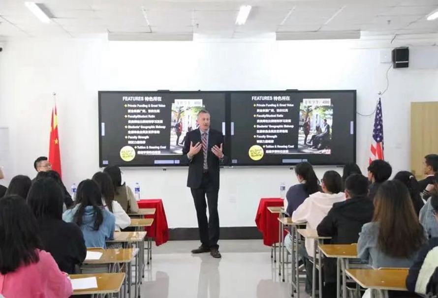 Dr.Collins在本次宣讲会结合自身经历,从语言的习得、眼界的开阔、知识面的扩展等方面进行宣讲,激发了同学们出国留学的兴趣。宣传过程中哈町大学副校长简要介绍了学校项目和河外学子在哈町大学学习期间可选择的专业,具体有工商管理硕士、信息系统科学硕士和教育硕士。Collins副校长特地强调了哈町大学安全的校园环境。宣讲过程中还提到了此次宣讲项目的亮点是留学费用低,每年留学总费用含食宿费约人民币20-25万元,毕业后获得的哈町大学硕士学位受中国教育部认证学历。