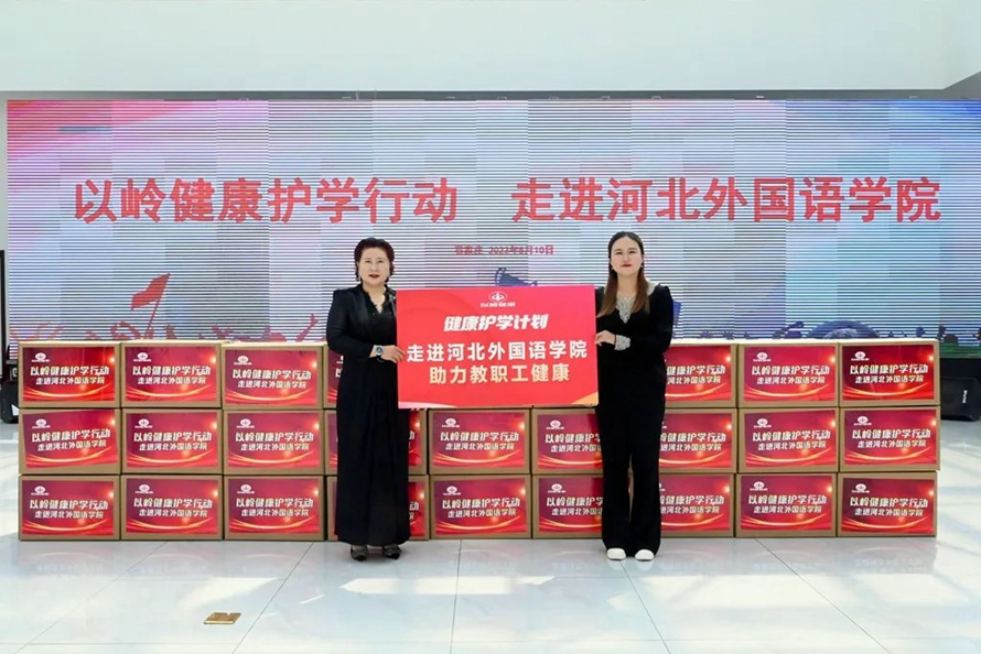 以岭健康科技有限公司董事长助理、大客户部总经理、石家庄以岭药堂大药房连锁有限公司总经理康薛梅,以岭健康科技有限公司大客户部河北省区经理杨晓梅,以岭健康科技有限公司大客户经理刘子昊代表以岭健康科技有限公司,通过河北省圣兰慈善基金会,向河北外国语学院捐赠健康礼袋共计600分,价值13万余元。