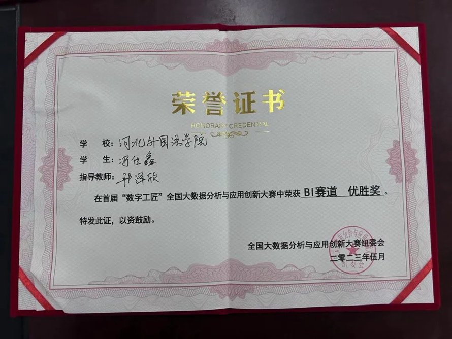 2023年5月27日,在西安理工大学举办的“数字人才发展论坛暨‘数字工匠’全国大数据分析与应用创新大赛颁奖典礼”圆满落幕,河北外国语学院计算机学院由业务副院长邢泽欣院长带领的22大数据本科班的刘东旭、冯佳鑫团队表现优异,获得了“数字工匠”BI赛道优胜奖,邢泽欣院长荣获优秀指导教师奖!
