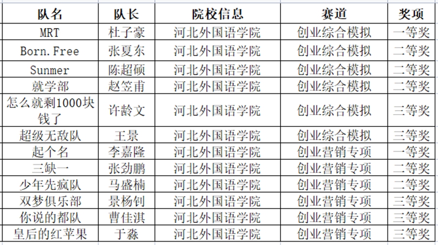 历经两个月的实践模拟和选拔,十二支团队脱颖而出,代表河北外国语学院参加河北省省赛,两支团队获得省级一等奖,五支团队获得省级二等奖,五支团队获得省级三等奖!