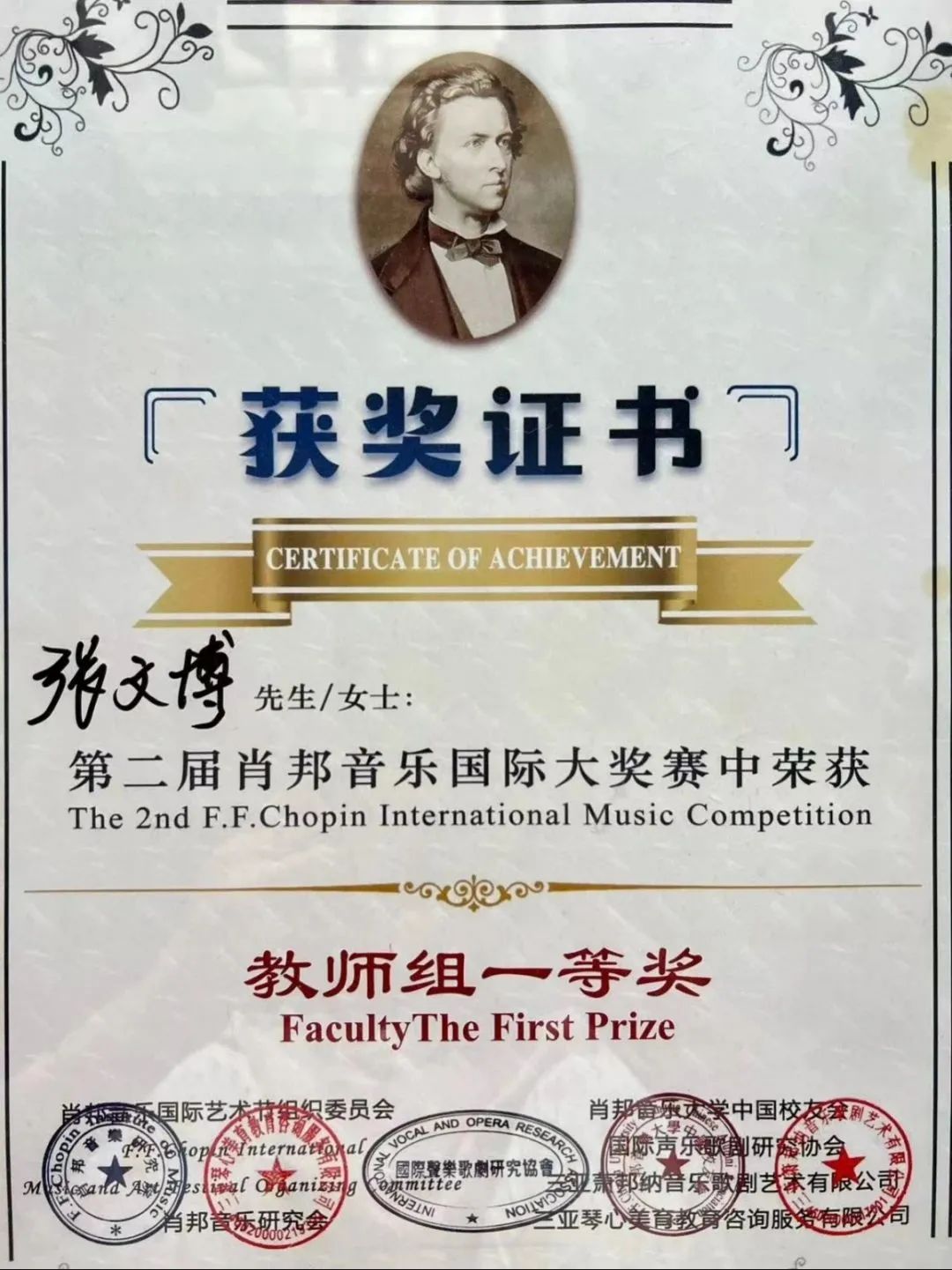 2023年4月,荣获第二届肖邦音乐国际大奖赛美声教师组一等奖。