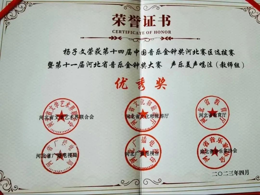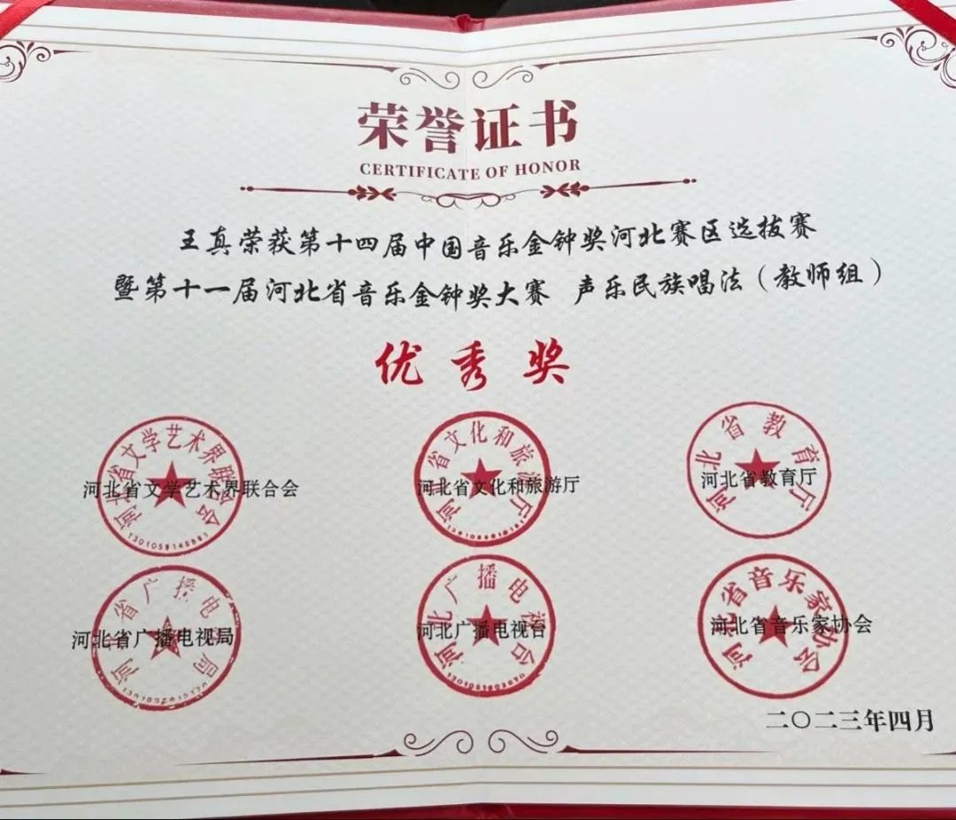 2023年4月,荣获第十四届中国音乐金钟奖河北省选拔赛声乐民族唱法教师组优秀奖;