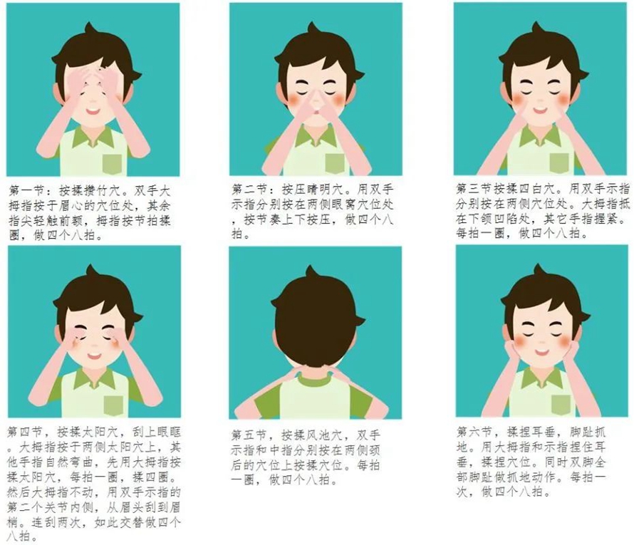 3、保证长时间用眼后休息。观看录播课件时,可以自己把握时间,设置手机闹钟,每30~40分钟提醒休息远眺10分钟。上完一节课,记得要远眺几分钟,或是做眼保健操,做眼保健操前一定要先洗手!这样间断性的用眼,可以让眼睛最大限度的得到放松。