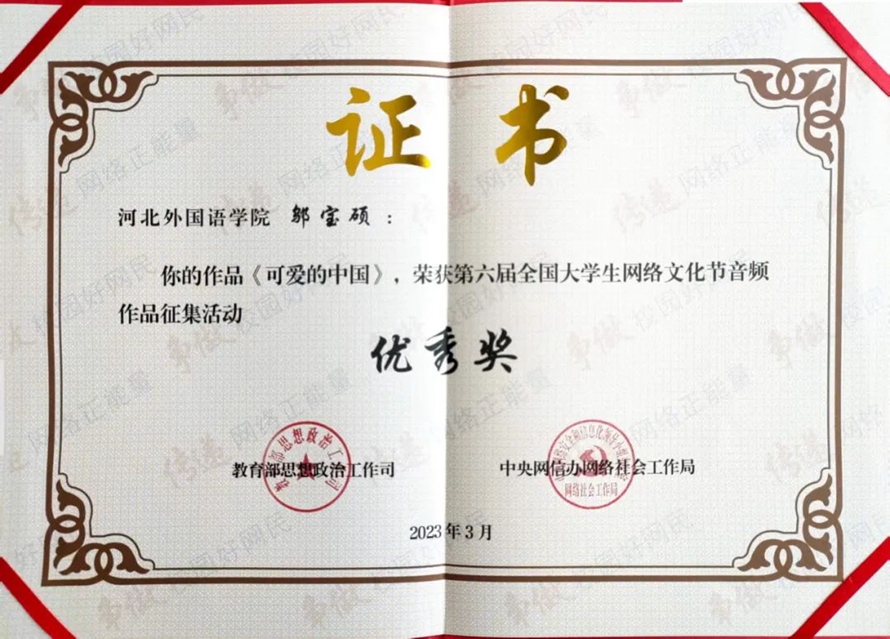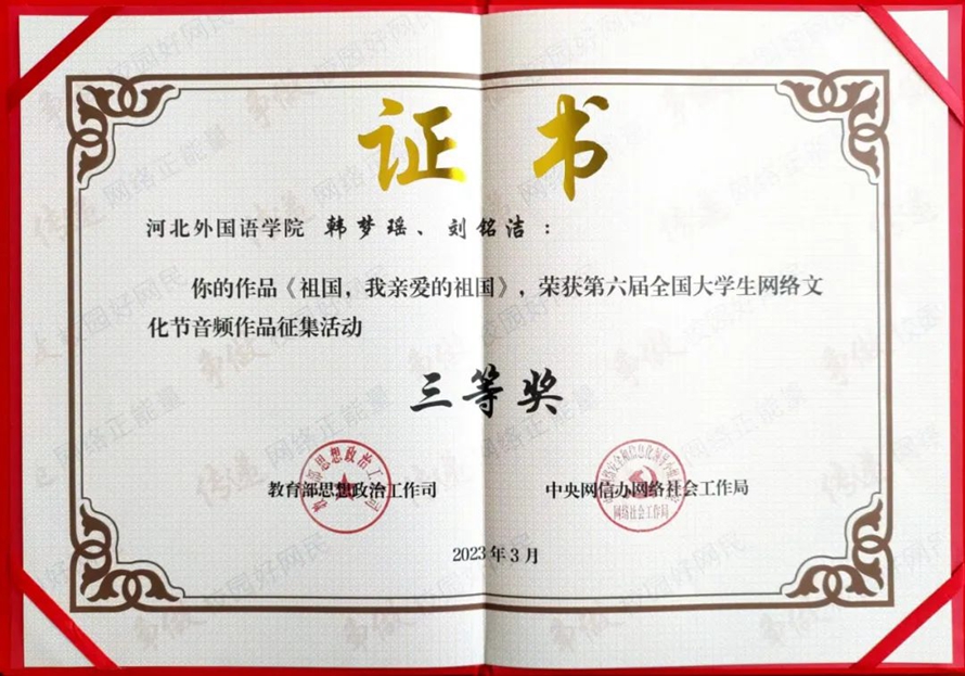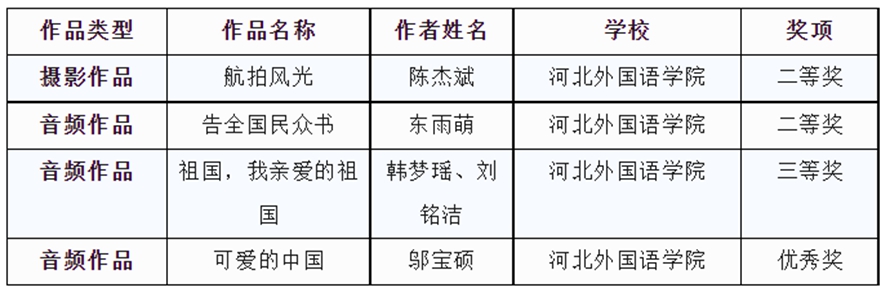 上述活动自开展以来,学校积极动员师生,组织征集、筛选作品参赛,最终陈杰斌、东雨萌、韩梦瑶、刘铭洁、邬宝硕等五位同学经过学校的层层选拔获得推选,并斩获国家级二等奖、三等奖、优秀奖共四项。以上奖项的获得彰显了河北外国语学院“以赛促学,以赛促教,教赛结合”的教育教学成果。