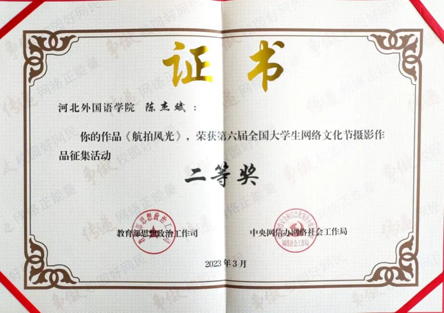 日前,由教育部思想政治工作司、中央网信办网络社会工作局联合主办,文汇报社承办的第六届“全国大学生网络文化节动漫作品征集”活动获奖证书发布,河北外国语学院摄影作品《航拍风光》荣获第六届全国大学生网络文化节二等奖、音频作品《告全国民众书》荣获全国二等奖、音频作品《祖国,我亲爱的祖国》荣获全国三等奖、音频作品《可爱的中国》荣获优秀奖!