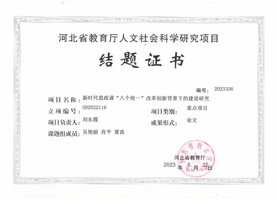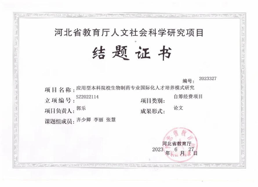 河北省高等学校人文社会科学研究项目是河北省教育厅面向全省普通高等学校设立的各类人文社会科学研究项目,河北外国语学院国际医学院郭乐老师主持的自筹项目《应用型本科院校生物制药专业国际化人才培养模式研究》(立项编号:SZ2022114)和国际商学院刘东霞院长主持的重点项目《新时代思政课“八个统一”改革创新背景下的建设研究》(立项编号:SD2022116),于2022年喜获立项,2023年顺利结项。