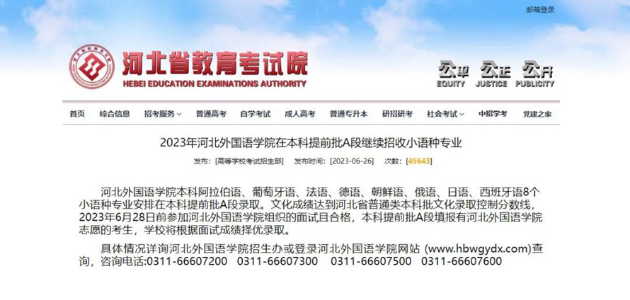 6月28日后,无论是网络平台上,还是招生办电话里,很多考生和家长表示,刚知道河北外国语学院本科小语种提前批有面试,而且录取条件是过了本科分数线,通过面试报了河北外国语学院本科提前批志愿,就能依据面试成绩从高分到低分择优录取。希望河外能够继续开展小语种本科提前批面试,为刚知道过本科线就有很大希望被录取的考生,提供一次机会。
