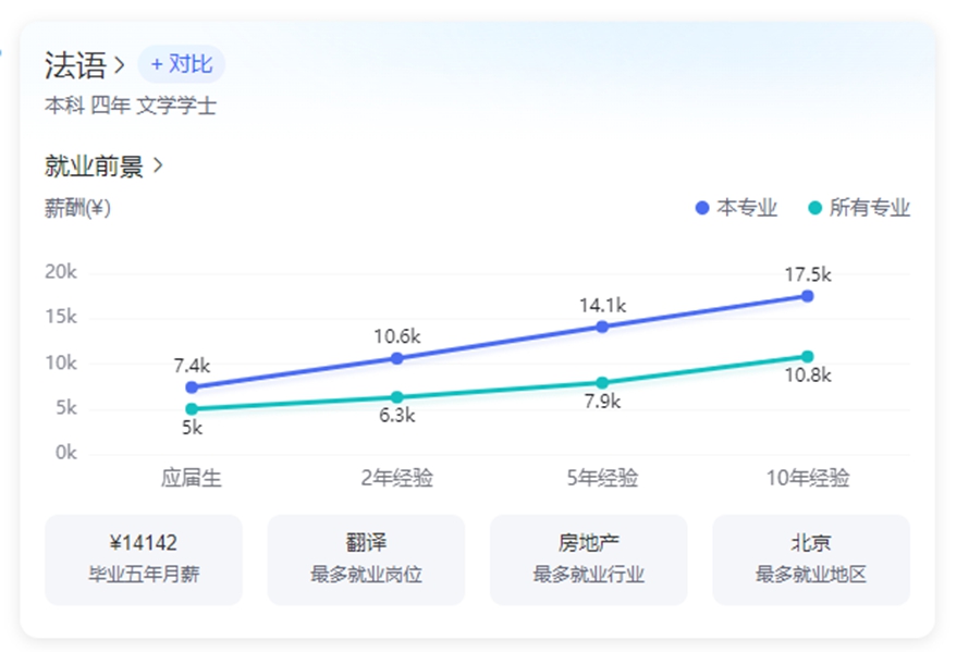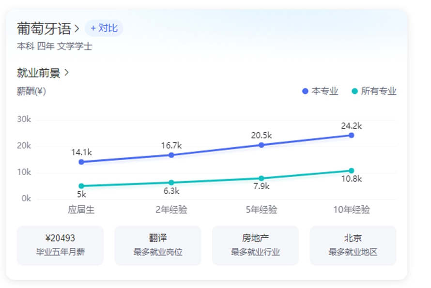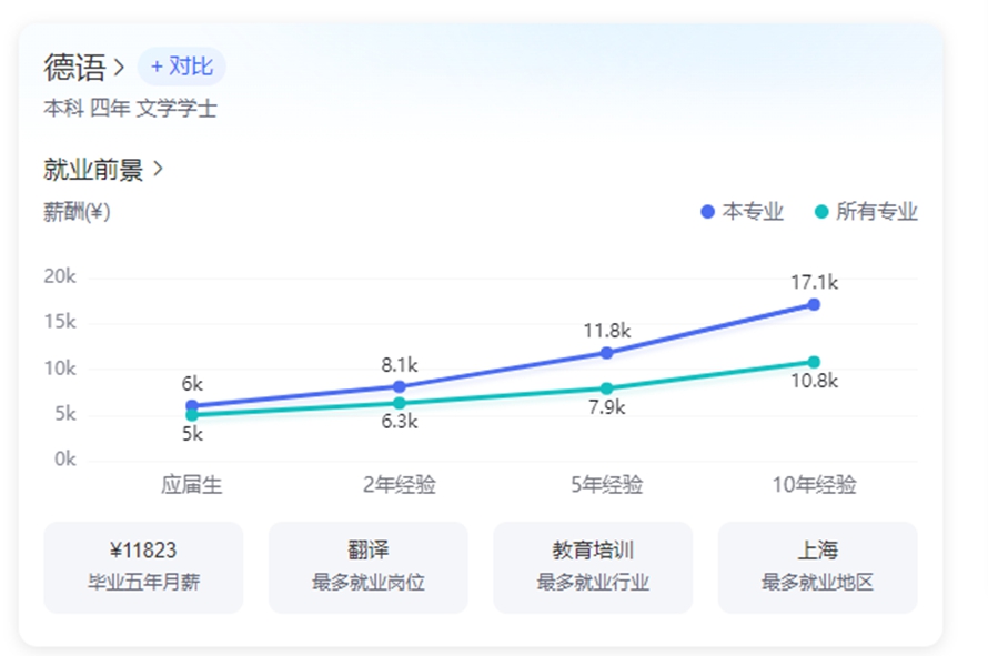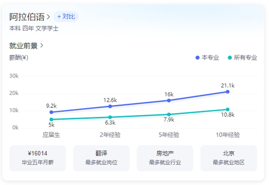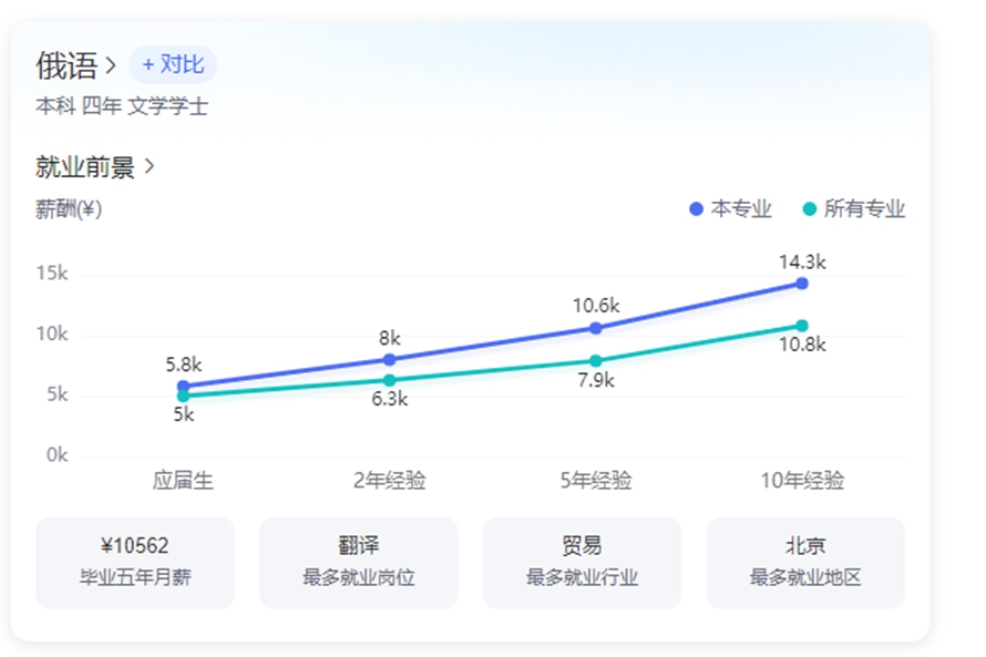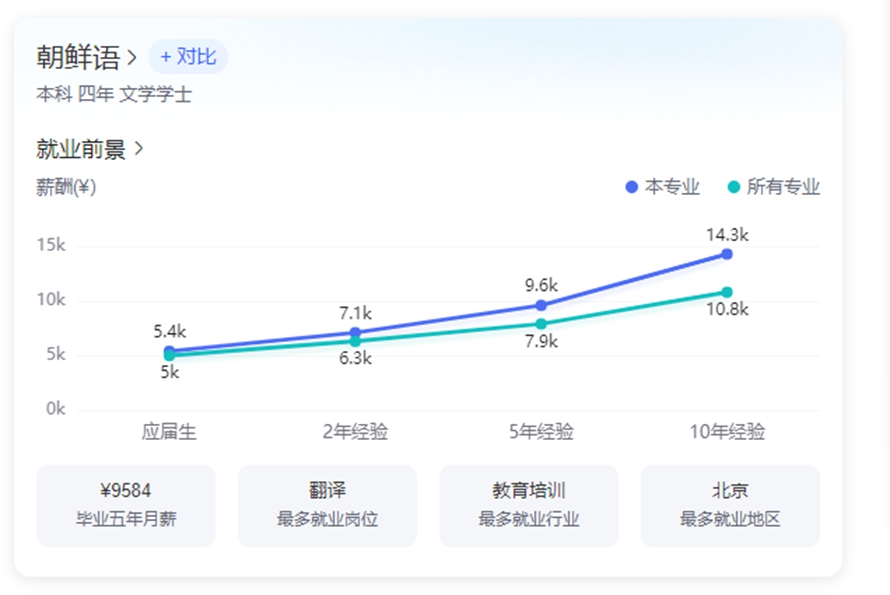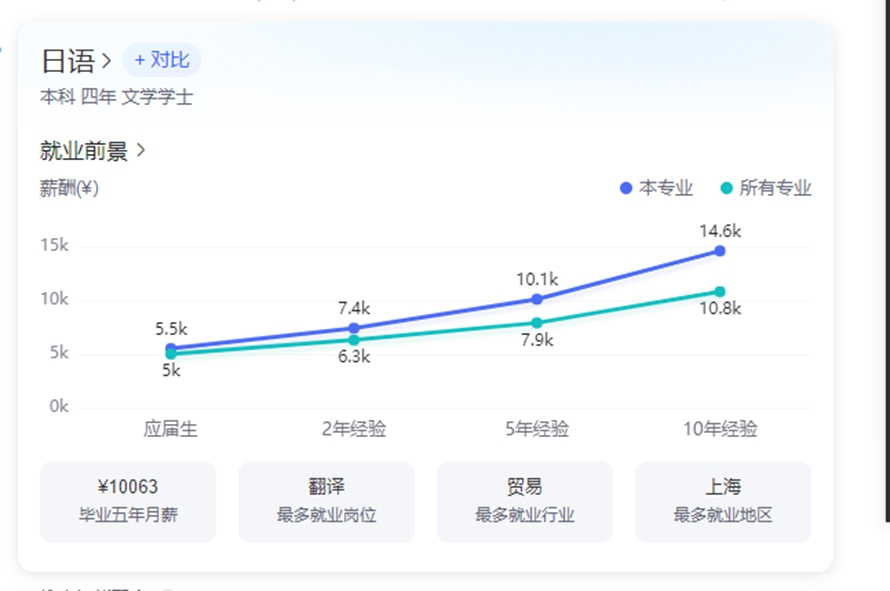 下面是各语种薪资待遇大数据情况,可见小语种专业薪资起步就比较 高,而且随着工作经验的增加,薪资优势越来越明显。