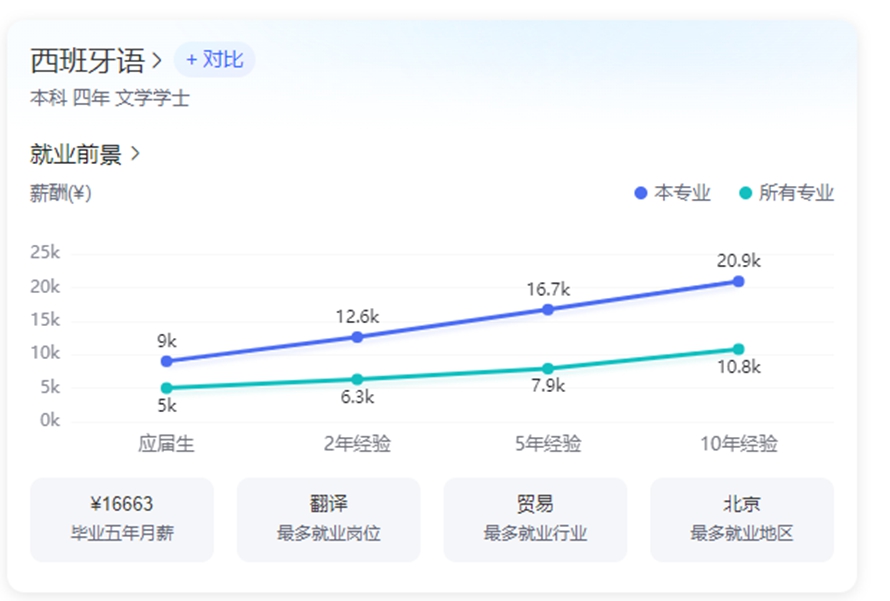 随着海外各国与中国往来密切,就业机会逐渐增多。在交流所用官方语言中,西班牙语、阿拉伯语、葡萄牙语、意大利语等专业人才紧缺,就业前景非常乐观。有调查显示,西班牙语、意大利语、法语、德语是薪资较高的“小语种”专业,紧随其后的是日语、朝鲜语。