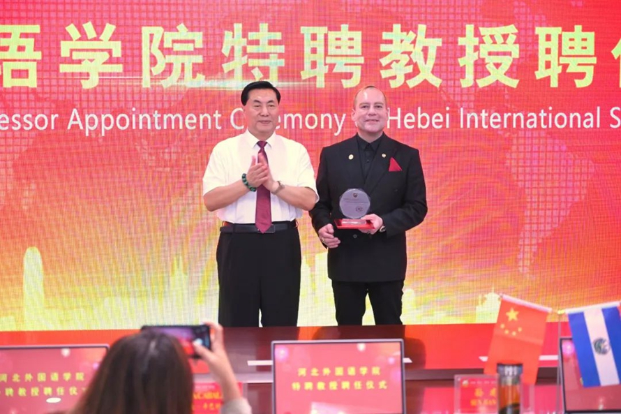 河北外国语学院董事长、校长孙建忠院士授予萨尔瓦多共和国驻华特命全权大使阿尔多·阿尔瓦雷斯教授特聘教授证书。