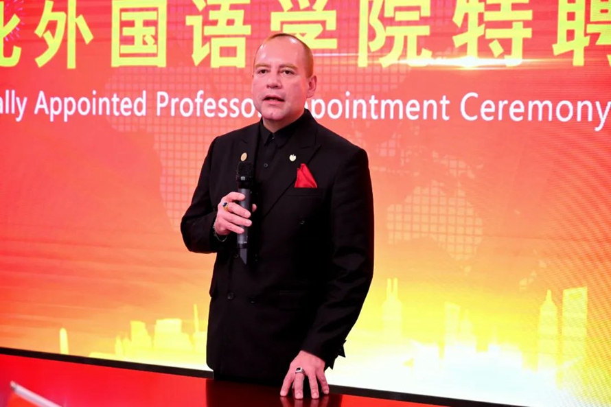 河北外国语学院校长外事助理、副校长杨振博士宣读《关于聘任萨尔瓦多共和国特命全权大使阿尔多·阿尔瓦雷斯为河北外国语学院特聘教授的决定》。