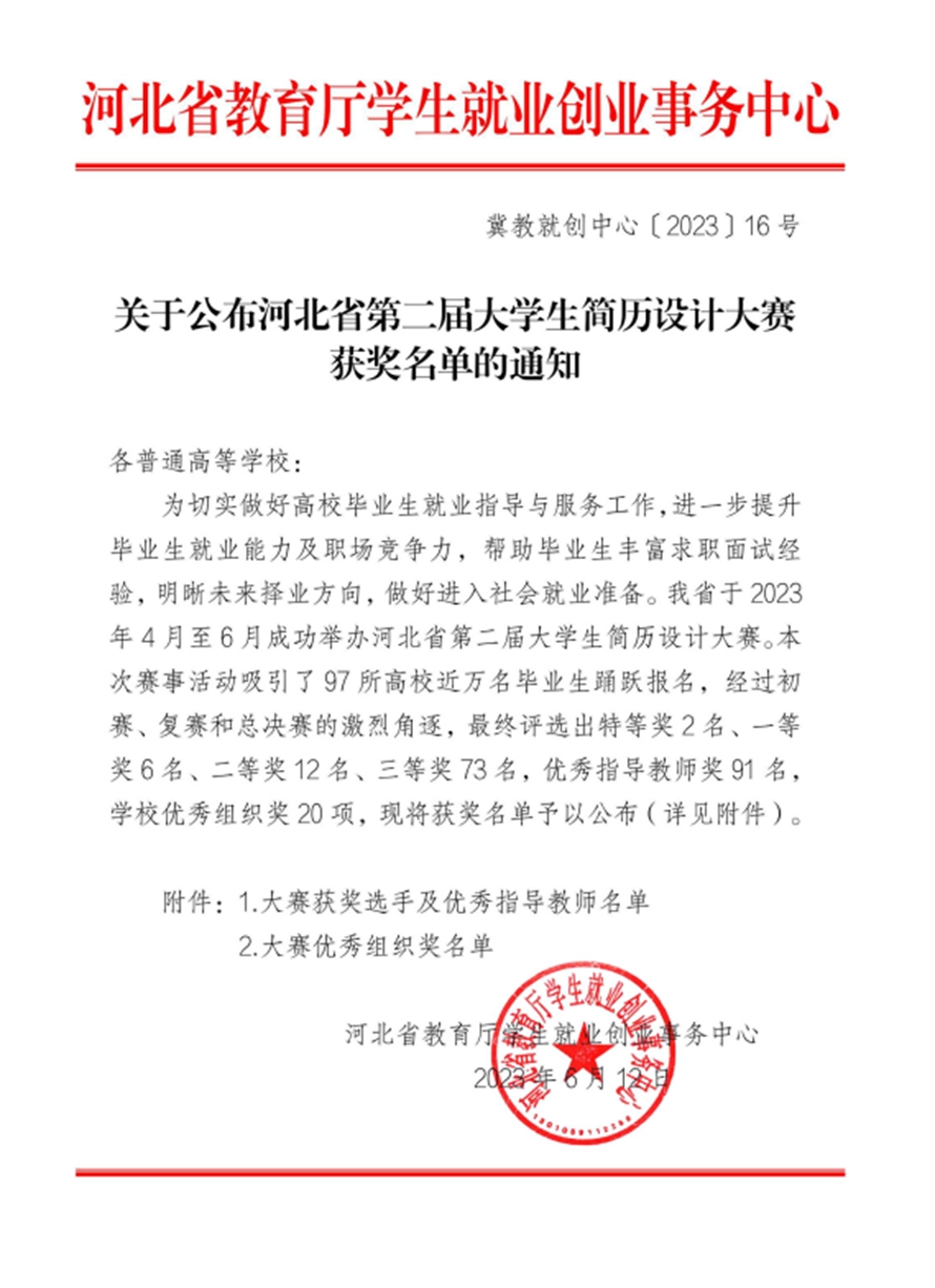 近日,河北省第二届大学生简历设计大赛在河北科技大学圆满落幕。河北外国语学院王晓龙、李晶怡、王金玲、孙嘉遥四名同学荣获三等奖,学校荣获优秀组织奖。