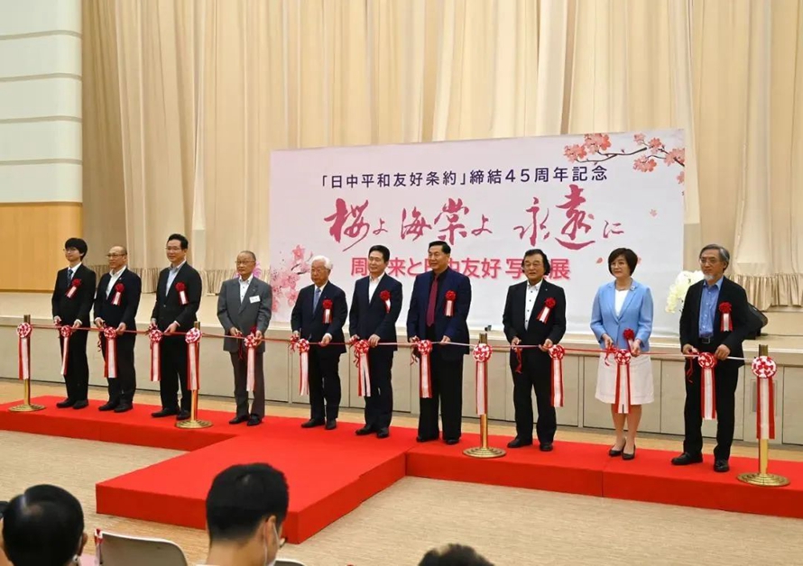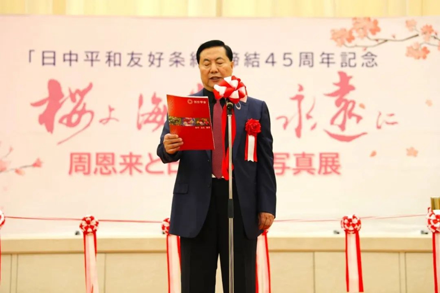 2023年7月12日上午,河北外国语学院董事长、校长孙建忠院士率代表团一行7人,出席“中日平和友好条约缔结45周年纪念暨《海棠樱花永相传――周恩来中日友好图片展》开幕式并致辞。