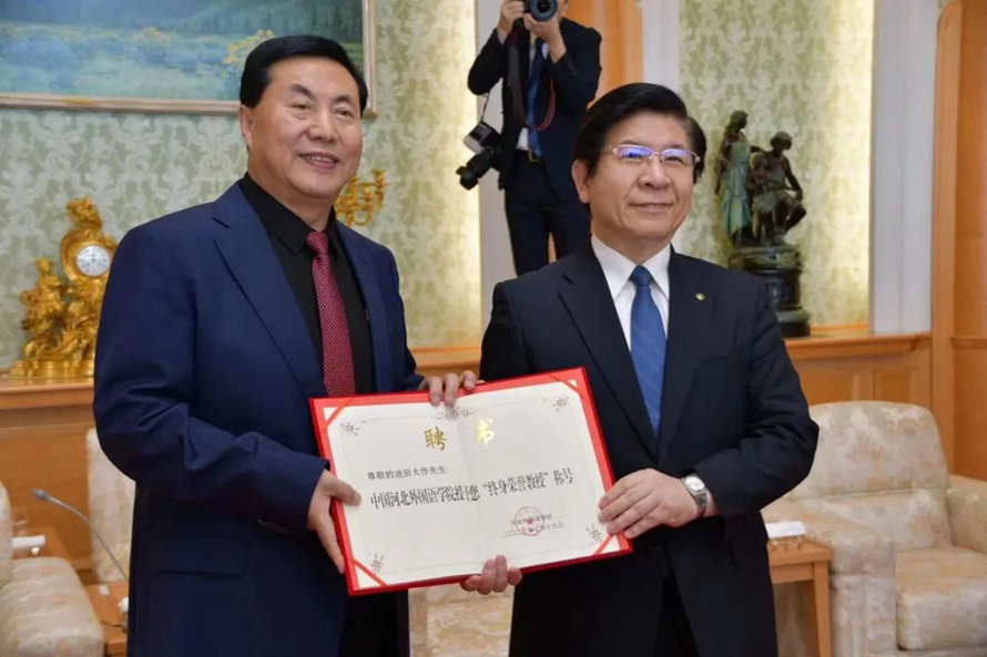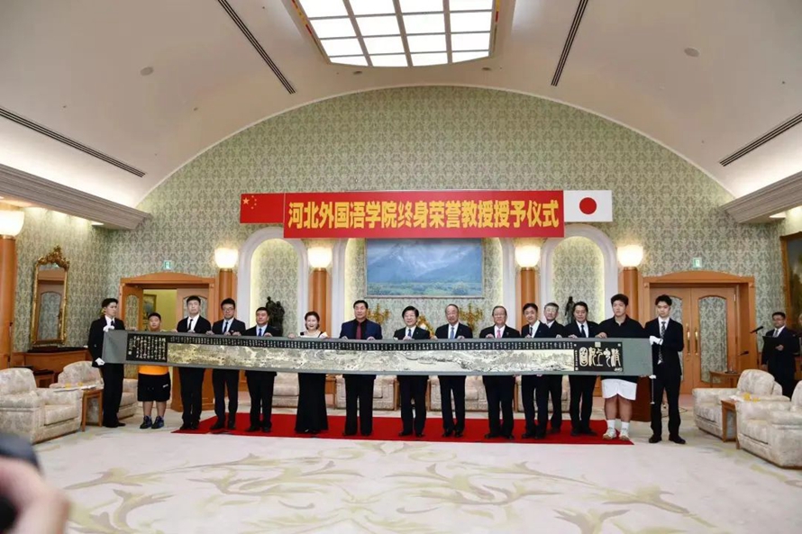 在合唱完庄严的中华人民共和国国歌后,孙校长宣布了《河北外国语学院董事会敬聘池田大作先生为河北外国语学院“终身荣誉教授”的决定》,并将“终身荣誉教授”的证书颁予池田大作先生。