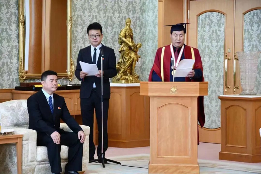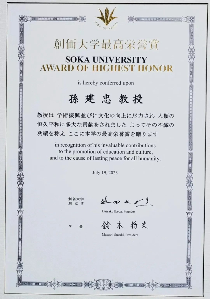 7月19日,日本创价大学为孙建忠校长举办了盛大的创价大学最高荣誉奖授予仪式。创价大学田代理事长和铃木校长分别为孙校长颁发“创价大学荣誉奖”奖章和徽章,学生自治会还为孙校长献上了代表两校荣誉的“创价友谊之证”。