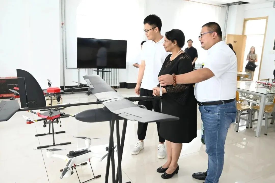 代表团参观传媒学院无人机实训室、3D打印实训室、书法实训室、美术实训室,并在学生书法作品前合影留念
