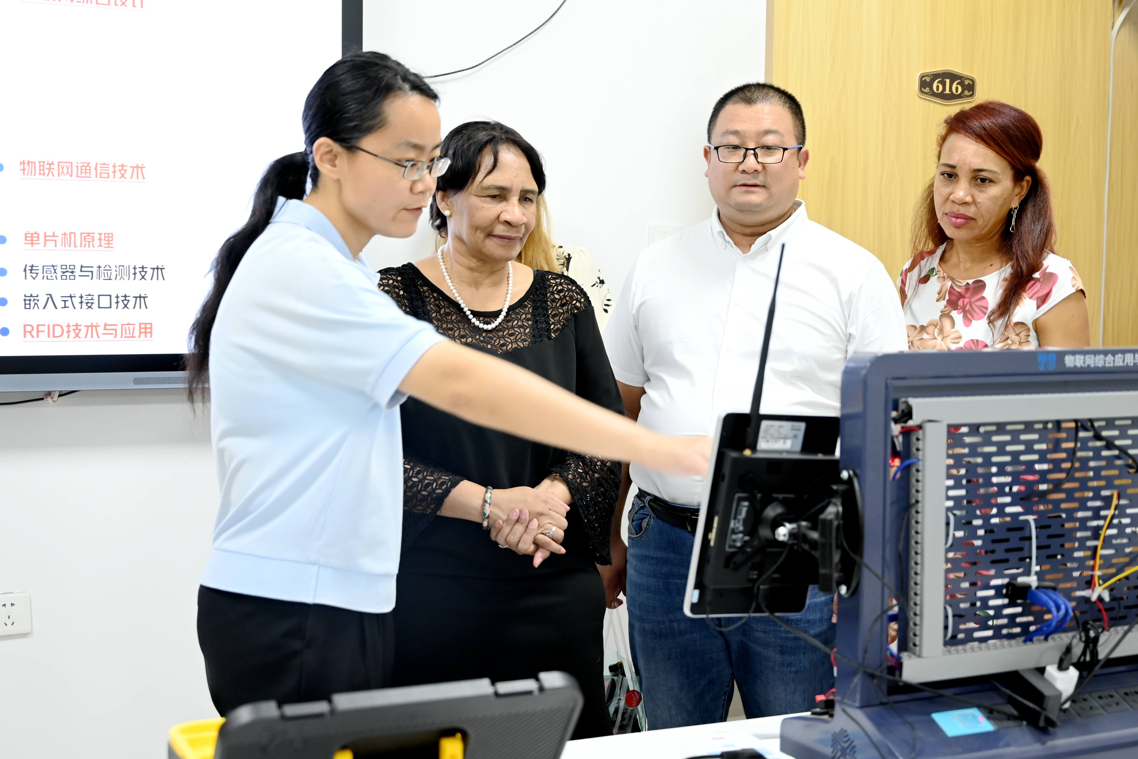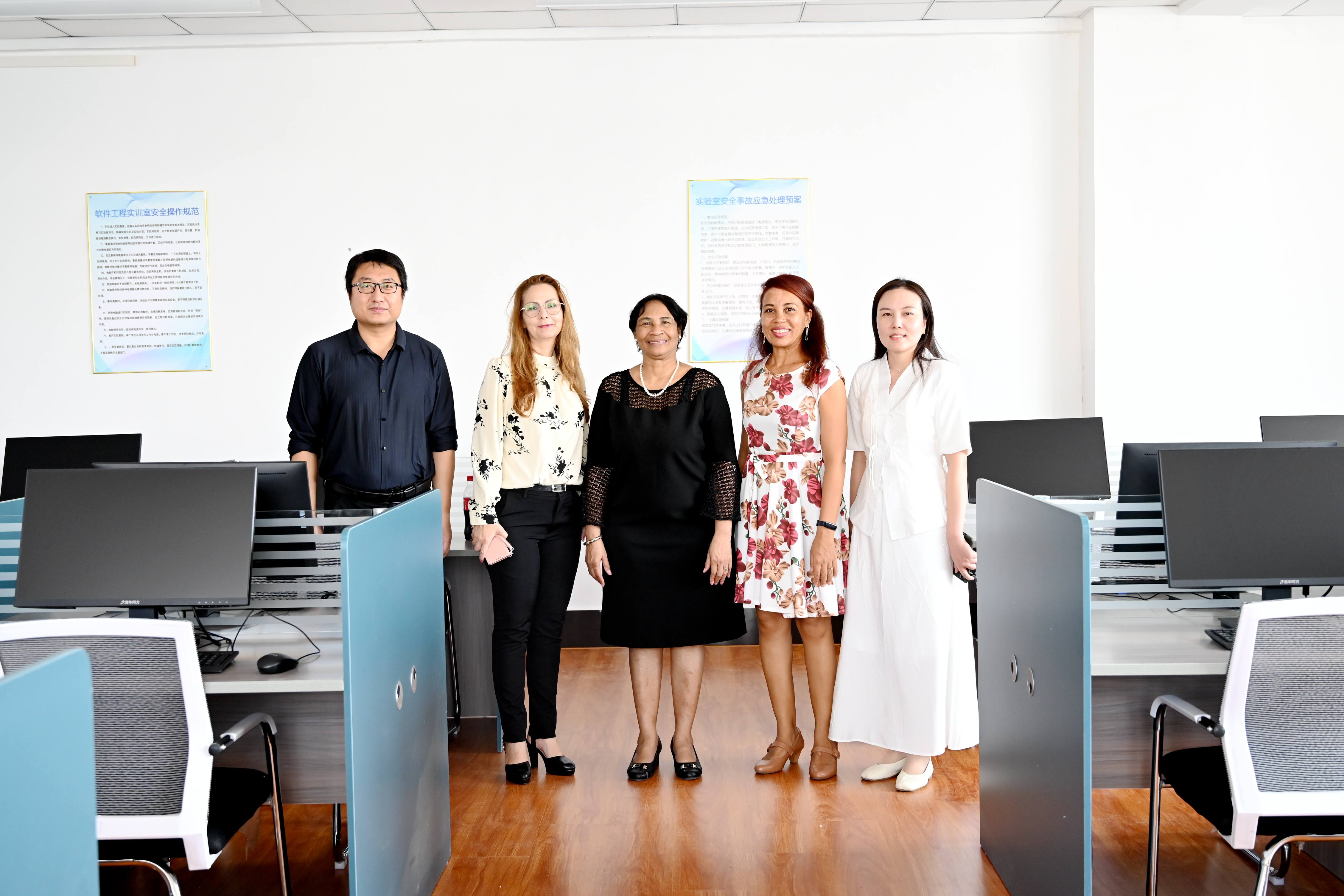 参观最后一站,哈瓦那代表团来到计算机学院实训室,作为相关领域的专家,米莉亚姆·尼卡多·加西亚校长认真了解了物联网、人工智能、大数据技术等专业课的实训开展情况,表示收获颇丰。