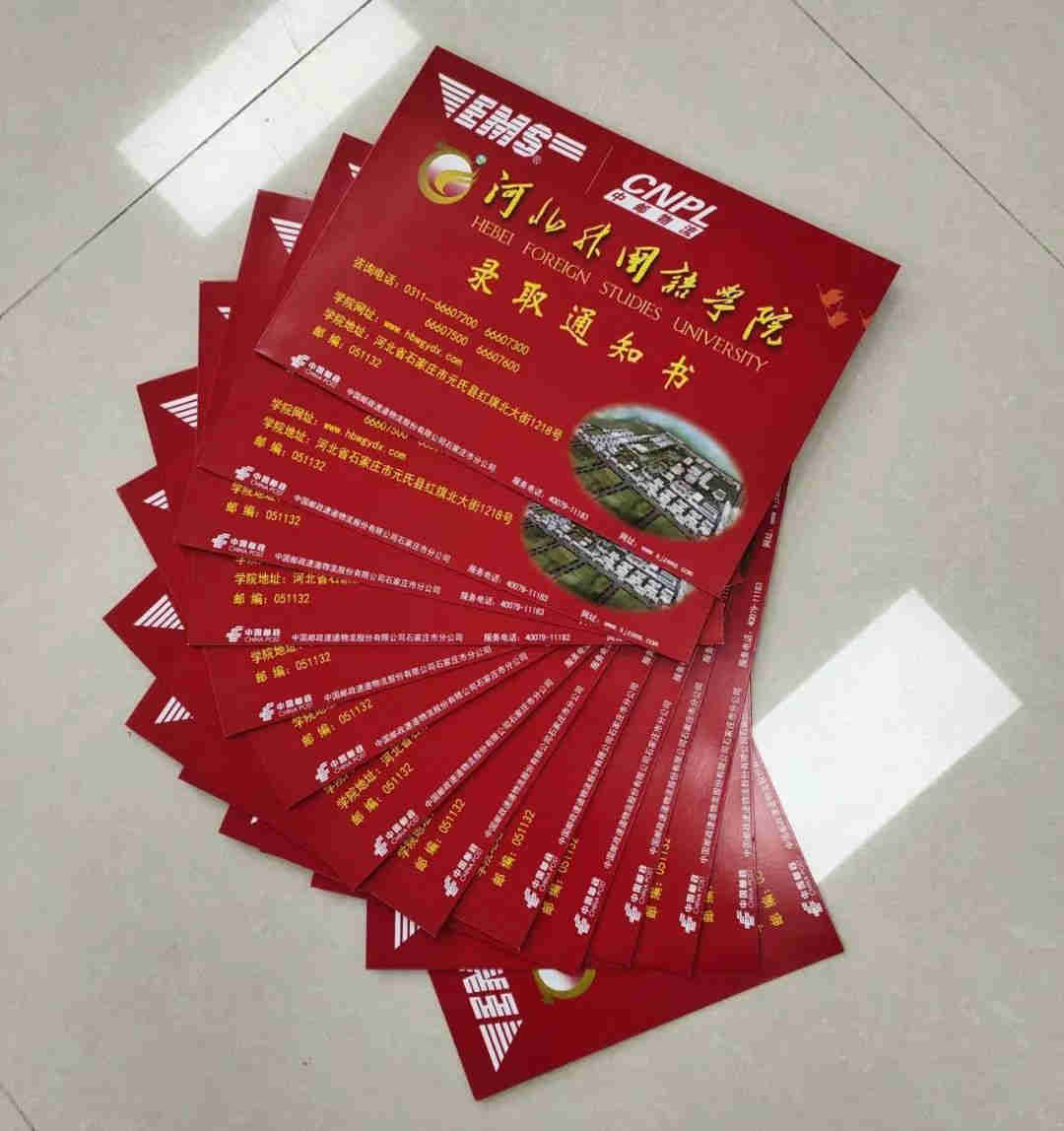 8月4日,河北外国语学院已将本科提前批A、本科提前批B、对口本科批,共计1218份通知书,已全部封装完毕寄出。