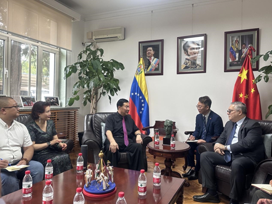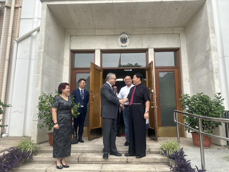 2023年8月10日,河北外国语学院董事长、校长孙建忠院士率团一行访问委内瑞拉驻华大使馆,委内瑞拉驻华特命全权大使朱塞佩·约夫雷达与使馆主要外交官在大使馆门口迎接。孙建忠校长与朱塞佩·约夫雷达大使相拥问候。