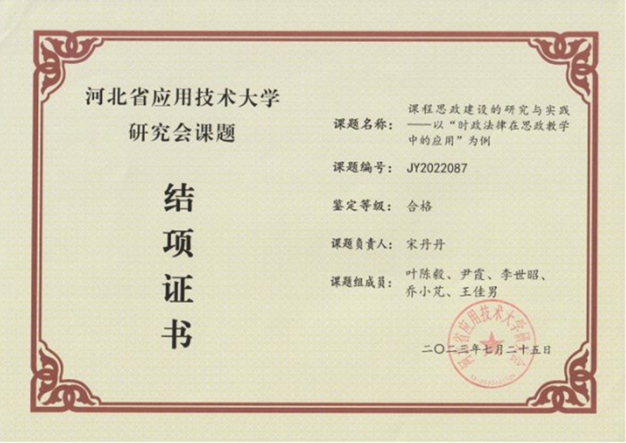 由科学技术处宋丹丹老师主持的课题《课程思政建设的研究与实践——以“时政法律在思政教学中的应用”为例》(立项编号:JY2022087)