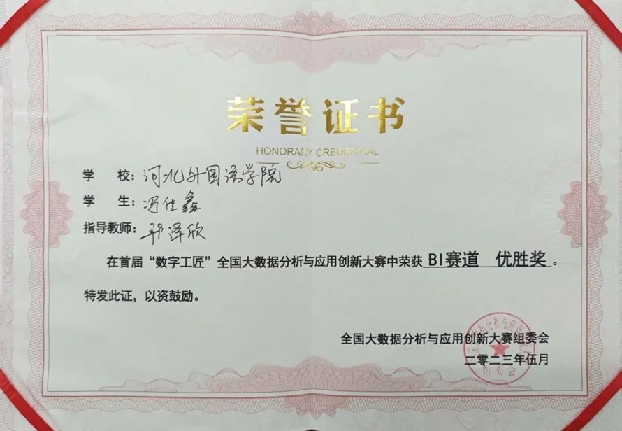 2023年5月27日,在西安理工大学举办的“数字人才发展论坛暨‘数字工匠’全国大数据分析与应用创新大赛颁奖典礼”圆满落幕。河北外国语学院计算机学院业务院长邢泽欣,带领22大数据本班的刘东旭、冯佳鑫团队,取得了“数字工匠”大赛河北省第一名的优异成绩,并打入决赛获得BI赛道优胜奖,邢泽欣院长荣获优秀指导教师奖!