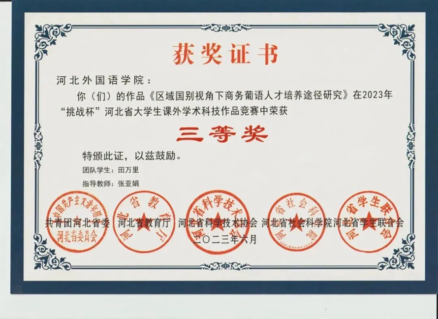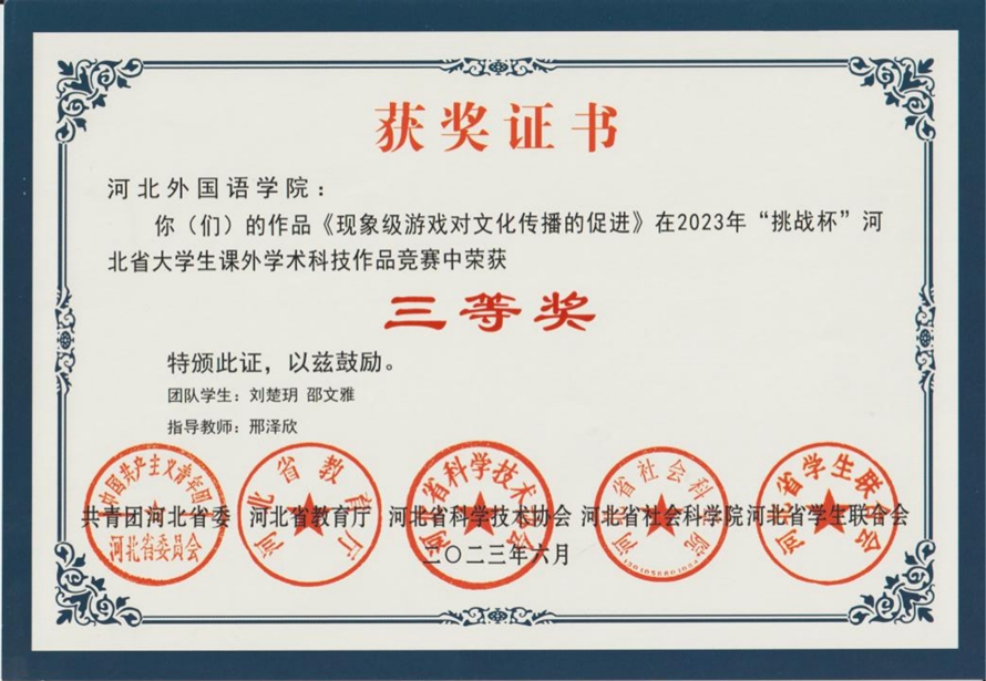 近日,由共青团河北省委、省教育厅、省科学技术协会、省社会科学院、省学联联合主办的2023年“挑战杯”河北省大学生课外学术科技作品竞赛获奖名单发布。河北外国语学院荣获二等奖2项,三等奖6项。